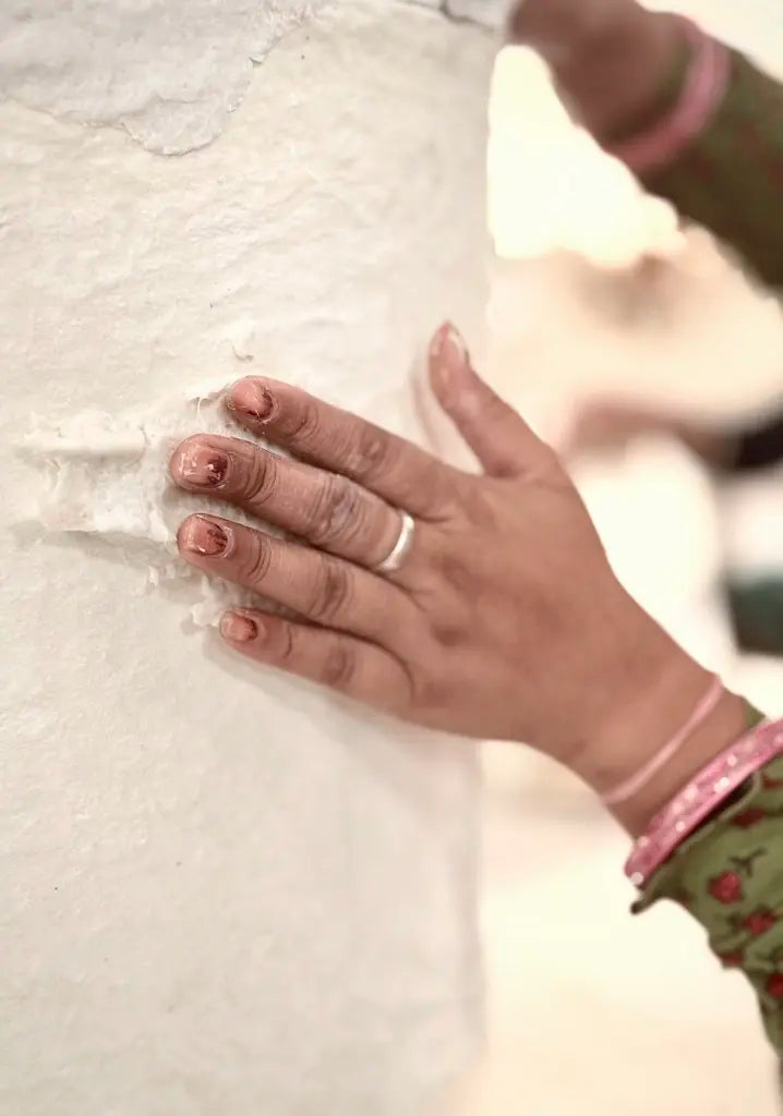 Una mezcla de algodón reciclado y papel, moldeada a mano.
